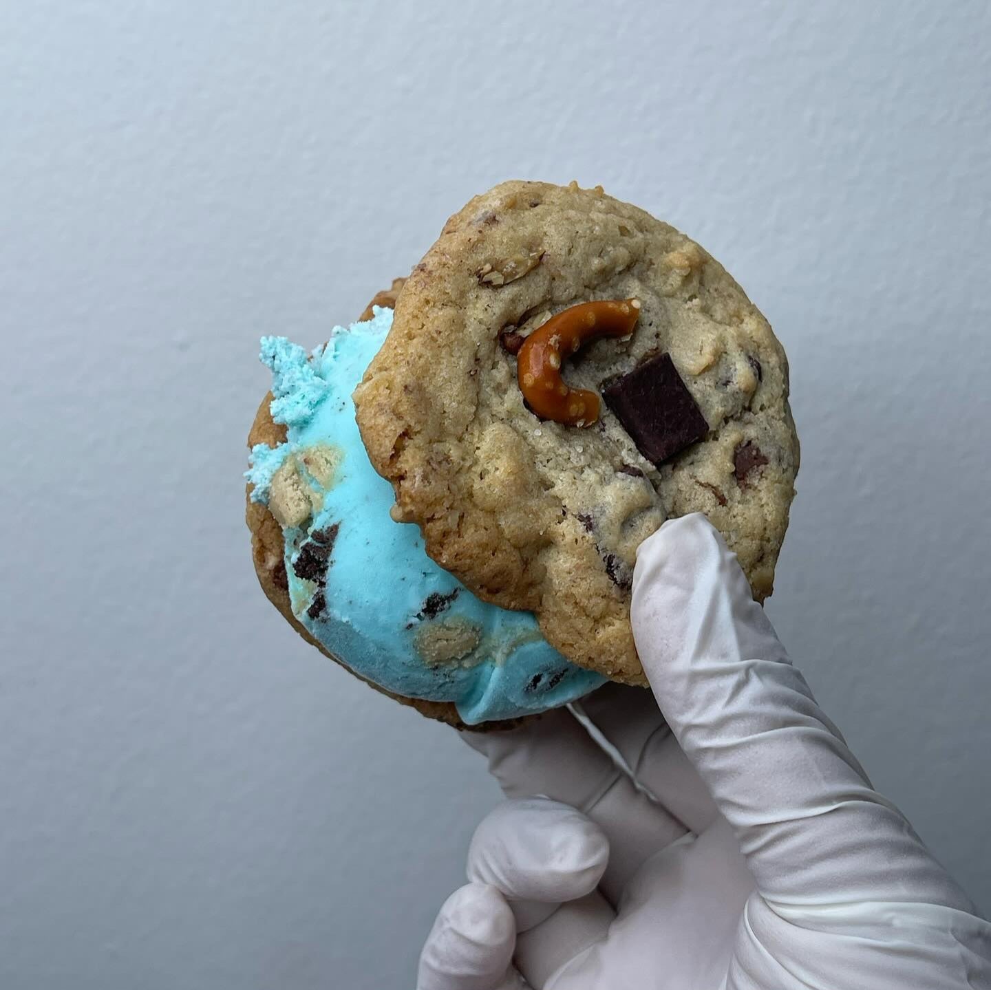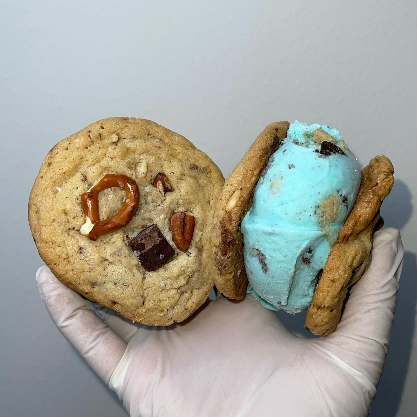 It's a chocolate chunk,toffee,pecan,pretzel, potato chip cookie /Cookie Monster ice cream (Dark blue moon flavored ice cream stuffed full of broken cookie chunks and cookie dough pieces)